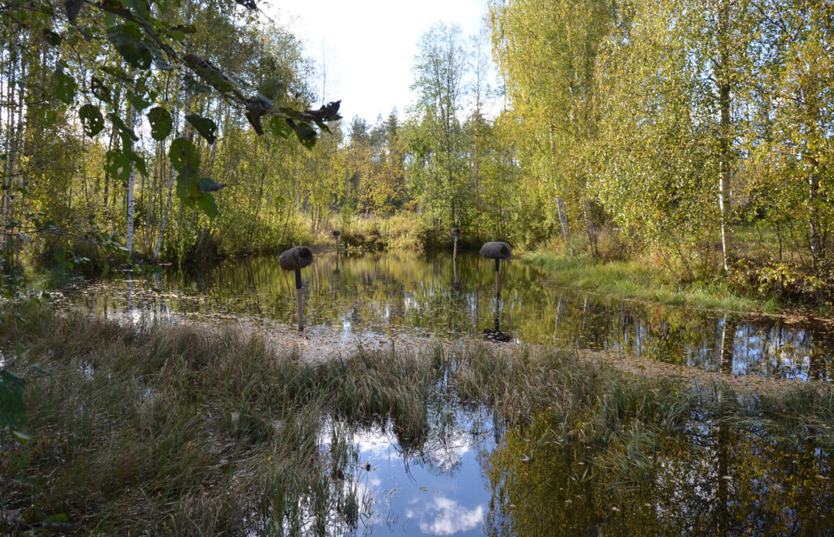 The observation site already had a wetland, and as part of the project, nesting tubes for ducks were built in its center. The poles supporting the nests are slippery, preventing mink and other predators from climbing up to the nests.